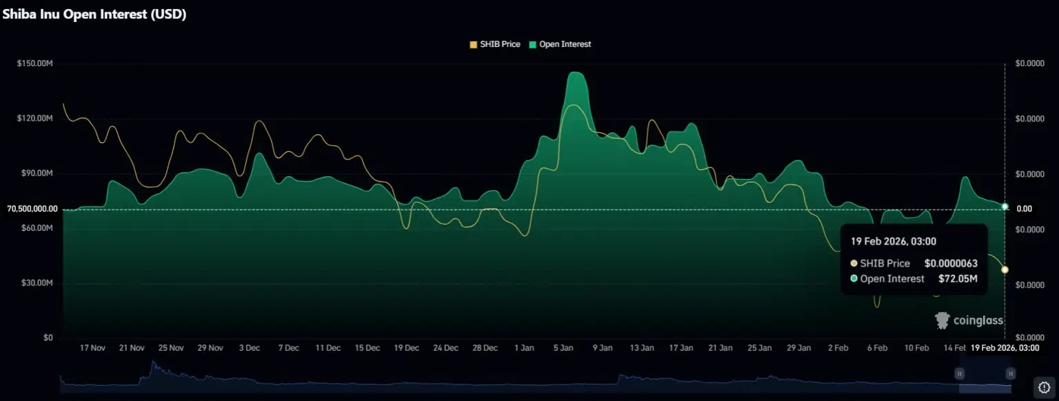 Open interest data adds another layer of caution. As of February 19, SHIB’s open interest stands at approximately $72 million. That figure is significantly lower than the early January peak above $140 million, when a strong price rally attracted leveraged positioning. The decline in open interest through late January and into February closely tracked the weakening price, a pattern consistent with long liquidations and reduced risk appetite.