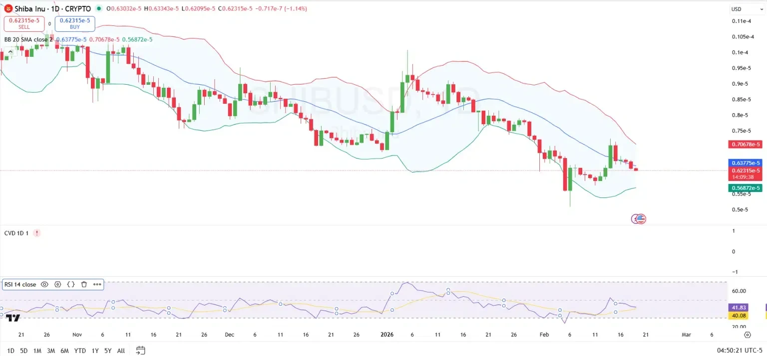 The Relative Strength Index (RSI-14) sits between 41 and 42. This places SHIB firmly in weak-to-neutral territory. The reading is not yet oversold, which means a technical bounce driven purely by exhaustion is not imminent. Momentum remains tilted to the downside.