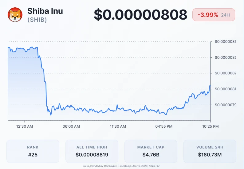 At the time of writing SHIB trades at around $0.00000808, down 3.99% over the last 24 hours.