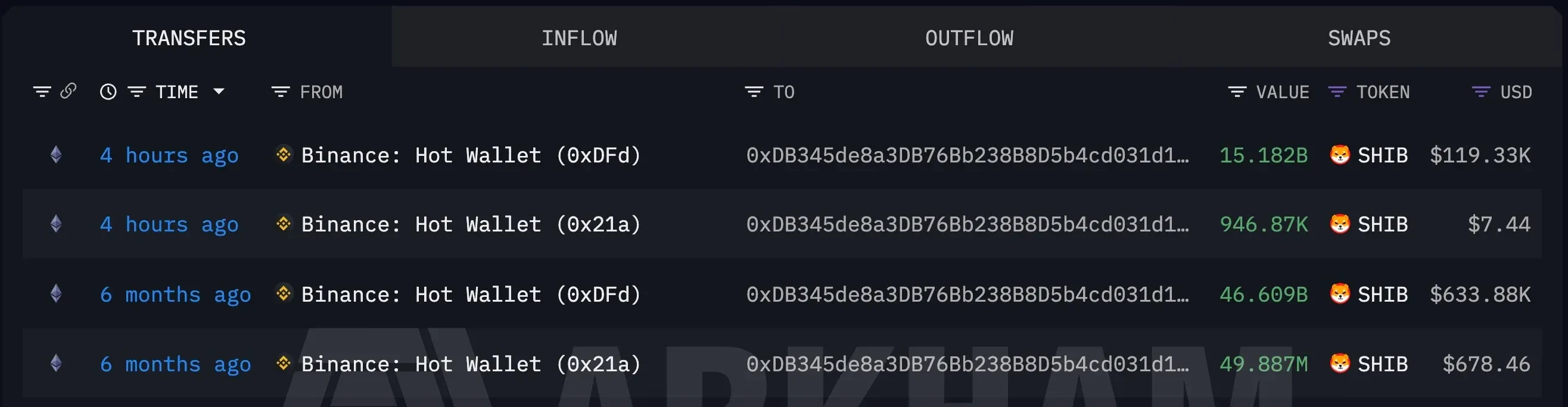 A previously inactive cryptocurrency whale has returned to accumulate Shiba Inu tokens after six months of silence. The wallet transferred 15.18 billion SHIB, worth approximately $119,330, from Binance, according to blockchain analytics platform Arkham.