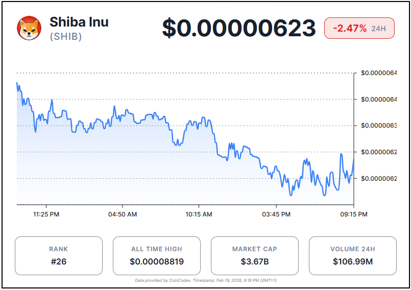 In the last 24 hours alone, SHIB dropped from an intraday high of $0.000006538 to a low of $0.000006143. That decline represents a fall of more than 3.8%. At the time of writing, SHIB trades at $0.00000623, marking a 2.47% loss within the same 24-hour window.