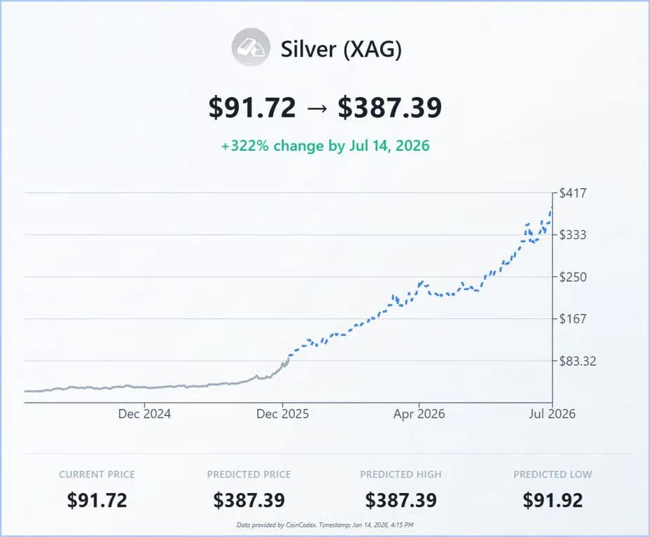 Meanwhile, the CoinCodex outlook for silver in 2026 points to a continuation of the current uptrend, with algorithm-based forecasts suggesting silver could climb sharply from current levels near $90 per ounce to well above $300 by mid-2026. That implies a projected rise of more than 300% if the model’s upper estimate materializes.