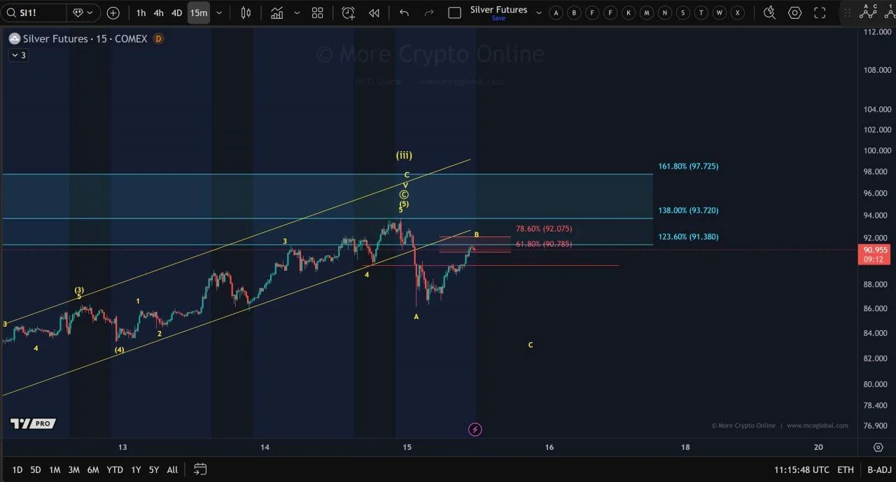 Silver futures traded near $90.95 on the 15 minute COMEX chart as a rebound stalled under a tight resistance band marked by Fibonacci retracement levels. Price bounced after a sharp overnight drop, then slowed as it tested the $90.79 to $92.08 zone, which lines up with the chart’s 61.8% and 78.6% markers.