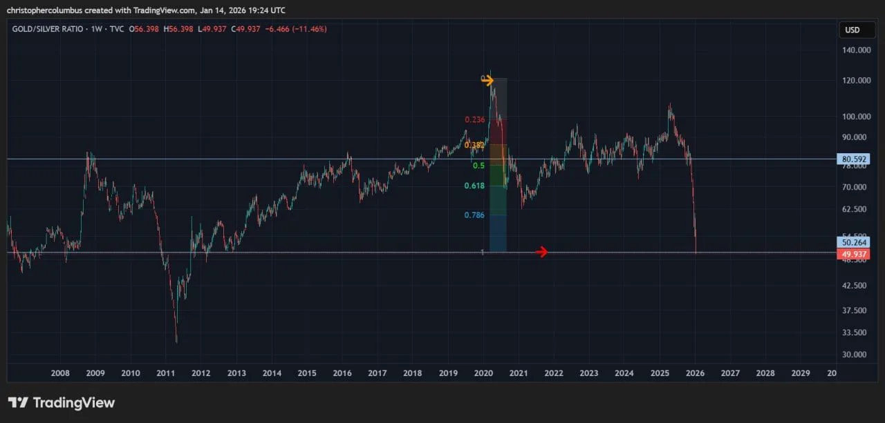 X user dave the wave said the target “reached” and framed the move as a shift in relative value between the two metals. When the ratio runs high, traders often interpret it as gold expensive versus silver, so they swap gold into silver. With the ratio now near 50, that logic flips, since each unit of silver can convert back into more gold than it could when the ratio sat higher.