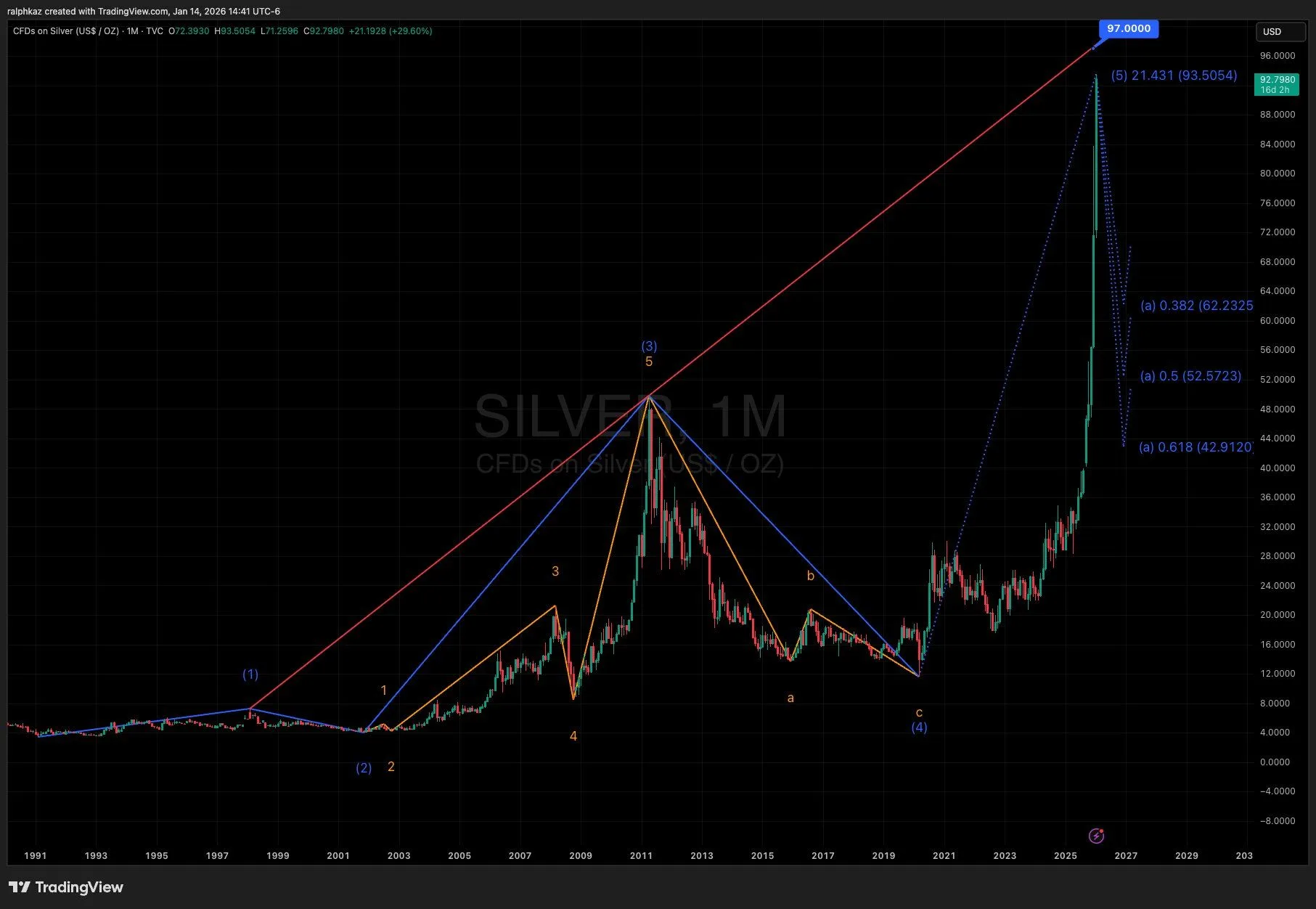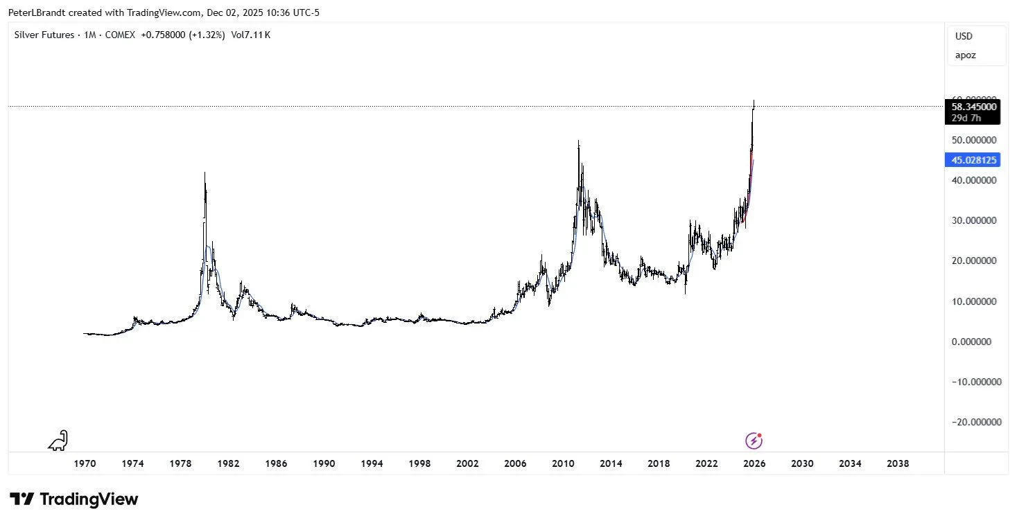 Technical analysts highlight the scale of the current move. Monthly chart patterns show silver clearing long-term extension targets, with some models identifying price discovery phases beyond prior highs.