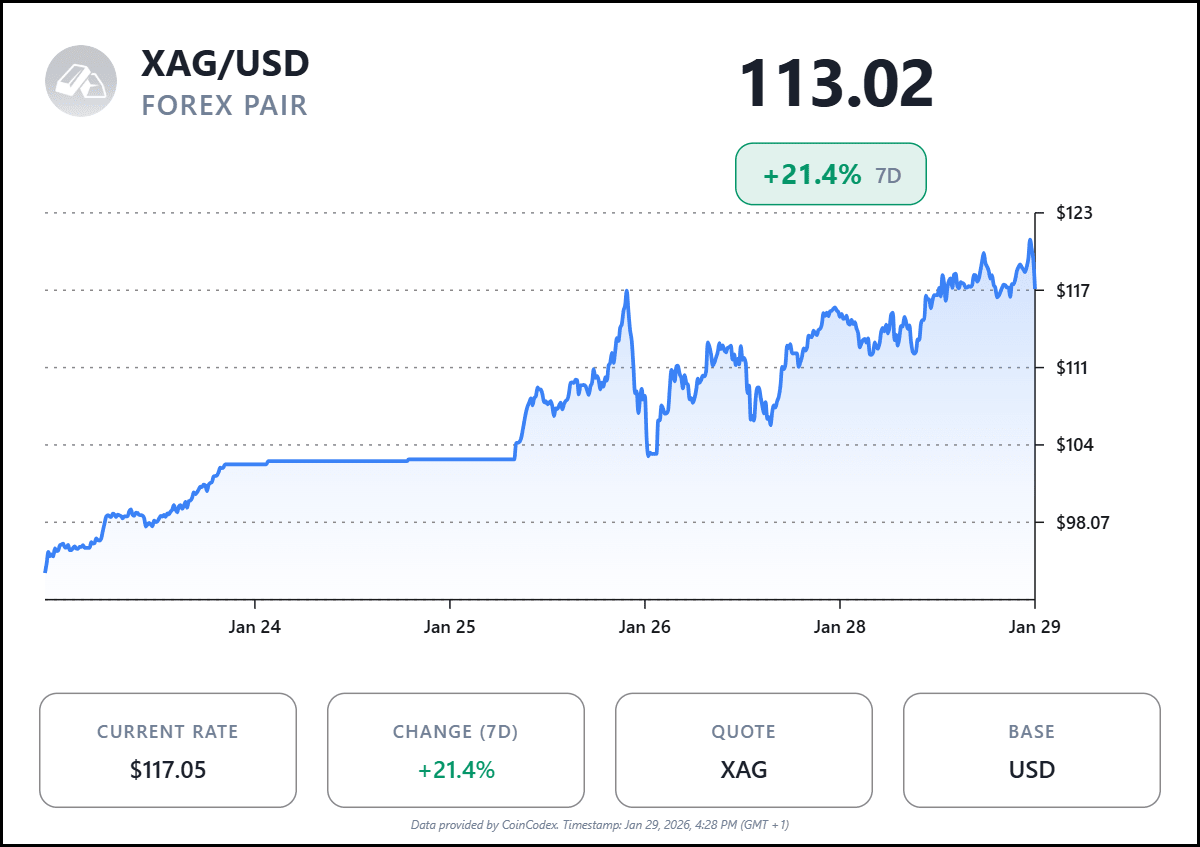 Silver climbed to a new all-time high near $120 an ounce on Wednesday, marking an explosive move after weeks of steady gains and a sharp acceleration in recent sessions.