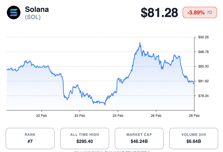 Solana’s price currently stands at $81.42, reflecting a recent decline. The asset dropped over 5% in the past 24 hours. Additionally, it slipped nearly 4% over the last week. Despite short-term weakness, analysts continue to monitor key support levels.