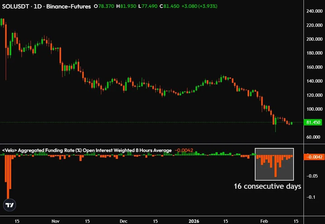 Solana futures funding rates stayed negative for 16 consecutive days, according to an aggregated open interest weighted eight hour average shown on a Binance Futures daily chart dated Feb. 15. The metric printed near minus 0.0042, which signals that short positions paid longs to hold exposure. Meanwhile, SOL traded near $81 on the daily chart, after extending a multi week decline that began in late 2025.