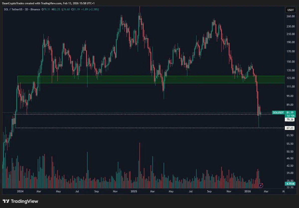 Solana hovered near the $80 level on the three day SOL/USDT chart from Binance dated Feb. 13, after a sharp breakdown from a long held range that had supported price through much of 2024 and 2025. The latest candles showed SOL trading near $81, following a steep selloff that pushed price below the green support band around the low $120s. As a result, the broader structure shifted lower after price failed to hold the prior consolidation zone.
