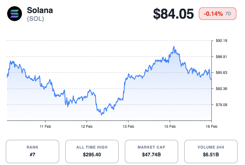However, Solana’s price remains under pressure. SOL trades at $84.17 after a 3.63% daily decline. The token holds a $47.86 billion market capitalization with strong liquidity.
