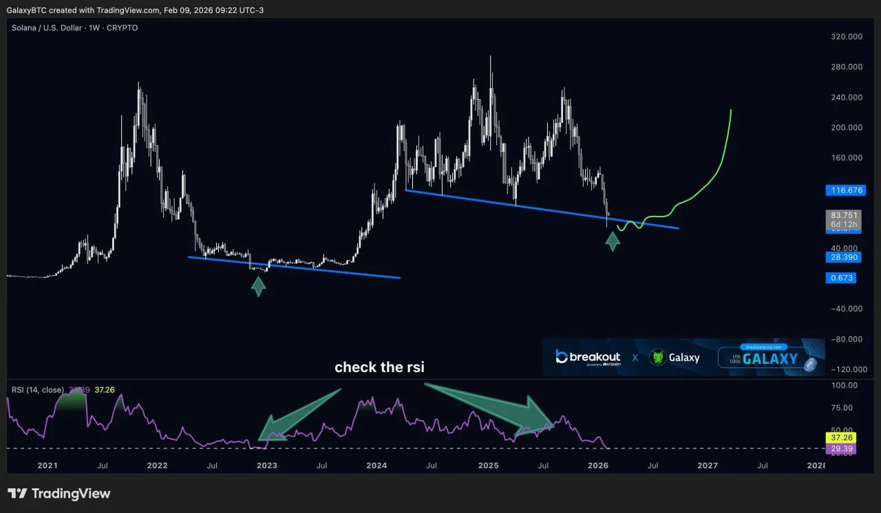 Solana’s weekly chart has started to resemble its 2022 structure that formed when SOL traded near $8, according to X user GalaxyBTC, who shared a TradingView snapshot dated Feb. 9.
