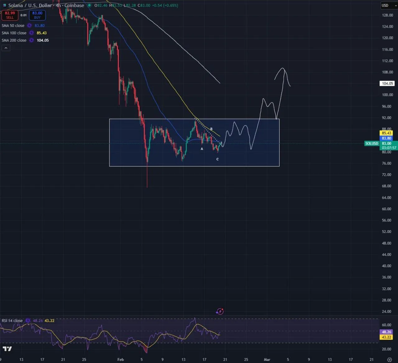 Solana traded near $83 on the 4-hour SOLUSD chart on Coinbase after an extended decline that pushed price well below major moving averages. The broader trend remained bearish, as SOL stayed under the 50-period, 100-period, and 200-period simple moving averages. At the time of the chart, the 50 SMA sat near $83.80, the 100 SMA near $85.43, and the 200 SMA near $104.05. Therefore, overhead resistance clustered above the current price zone.