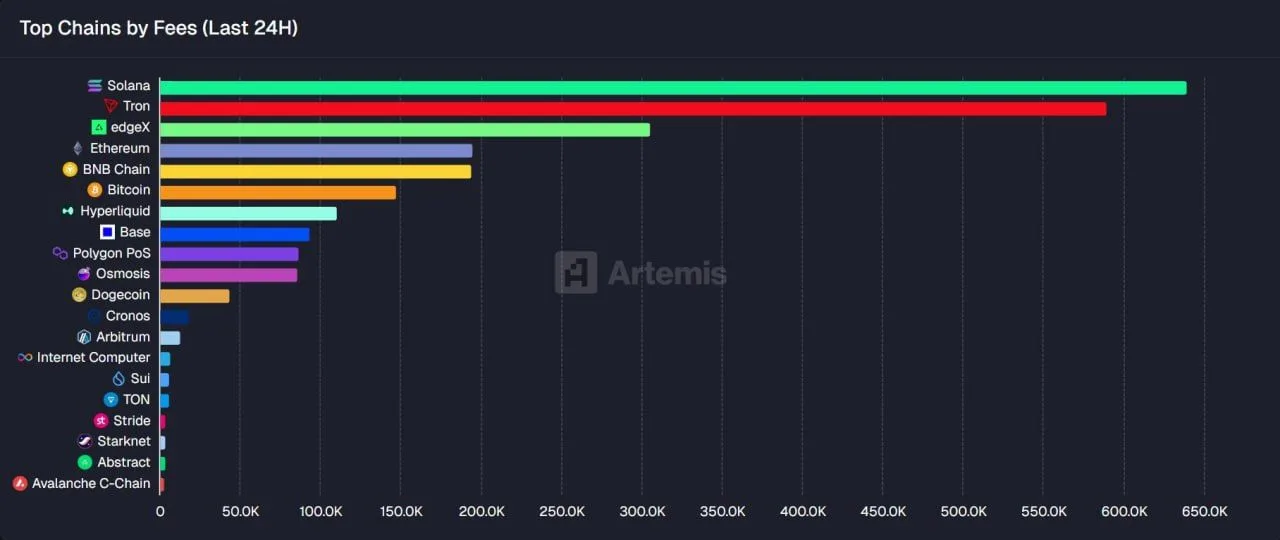 Top Chains by Fees Last 24 Hours. Source: Artemis via Solana Hub on X