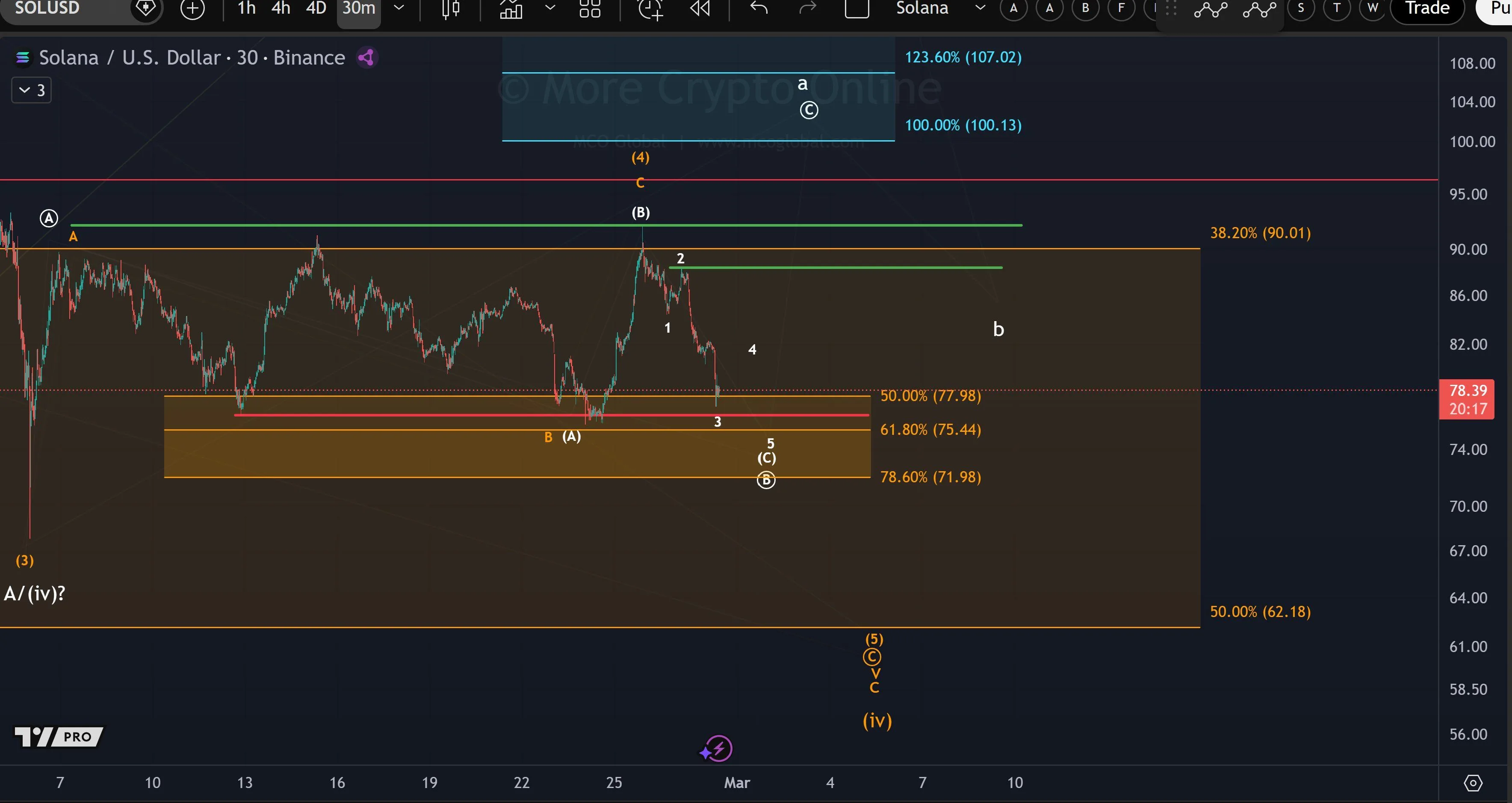 Morecryptoonl focuses on the broader multi-week range between roughly $62 and $90. Within that structure, Solana now tests support near the 61.8% retracement around $75–$78.