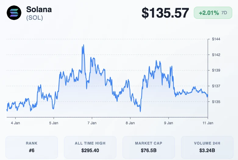 However, SOL price action shows near-term caution despite structural optimism. Solana traded near $135.31, posting a mild daily decline while maintaining a weekly gain above 2%. Market capitalization hovered near $76.3 billion, supported by steady circulation levels.