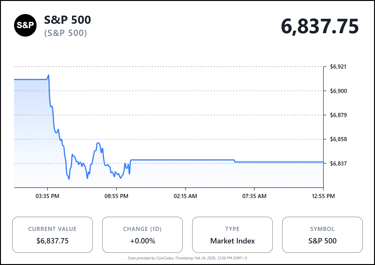 The S&P 500 closed at 6,837.75, down 71.76 points or 1.04%, as Wall Street entered the final stretch of February under pressure. Futures attempted to stabilize on Tuesday morning, yet investors remained cautious after steep losses driven by trade confusion and fears of AI-driven disruption.