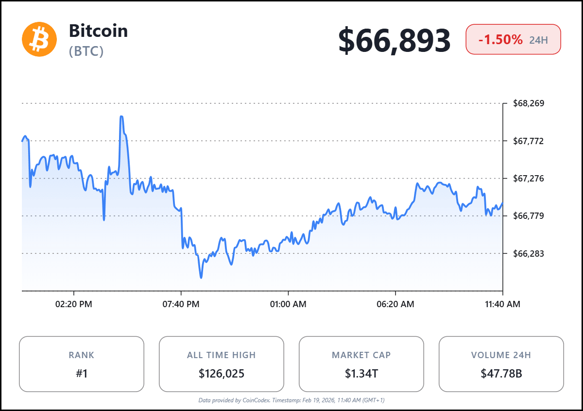 At current prices, the holding is valued near $454 million, with Bitcoin price trading around $66,895, down 2% in the last 24 hours. The same wallet cluster drew attention in August 2025, when the coins were worth about $700 million during higher market levels.