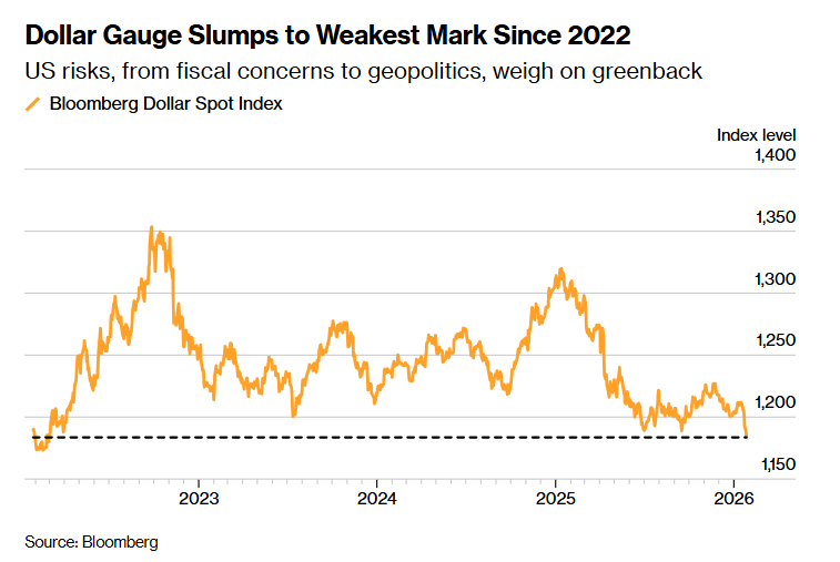 The US dollar traded near its weakest level in almost four years as of writing, extending losses for a fourth straight session. The Bloomberg Dollar Spot Index fell as much as 0.7% to its lowest level since March 2022, placing the greenback on track for its worst stretch since President Donald Trump announced universal tariffs last April.