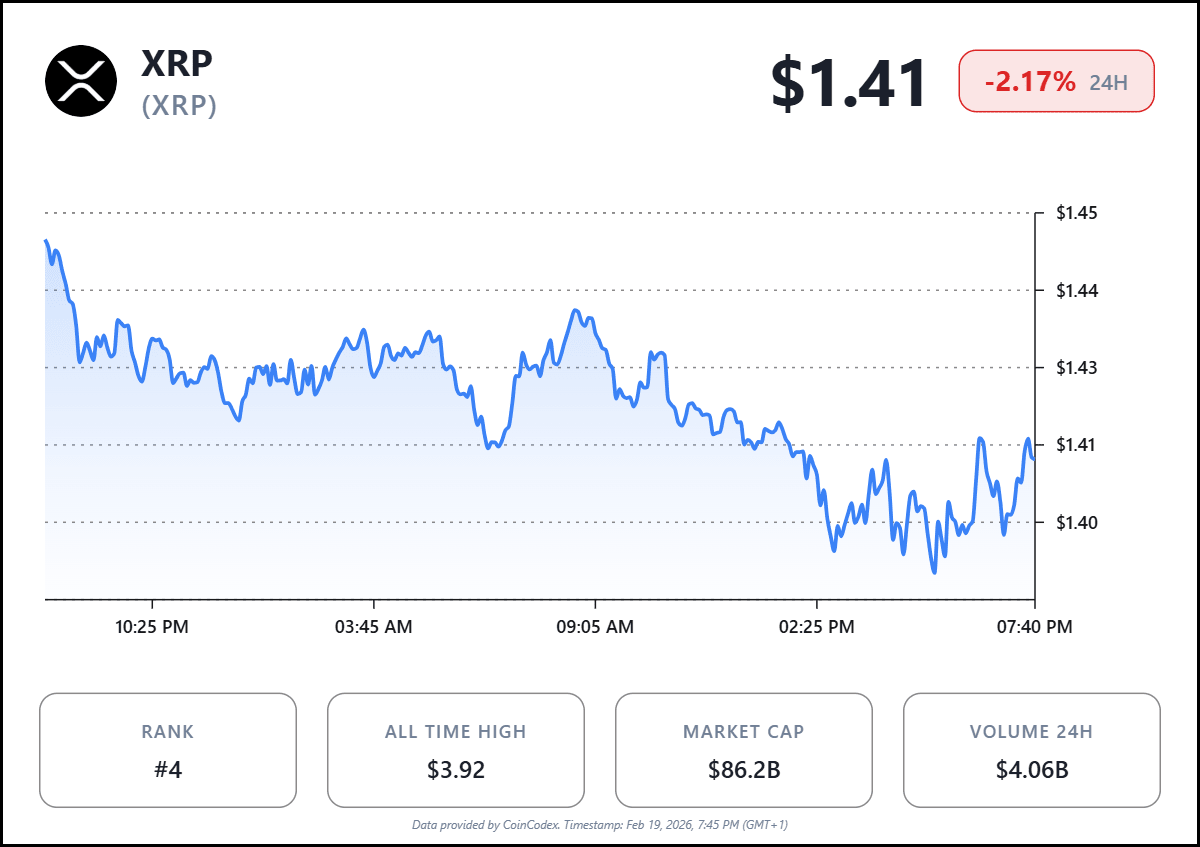 The partnership comes as XRP trades in a bearish environment. The asset has dropped about 60% from the 2025 all-time high of $3.66. Market pressure increased early this month as XRP lost the $1.5 support zone. The decline continued into February, and XRP fell to a 15-month low of $1.11 before recovering to about $1.41.